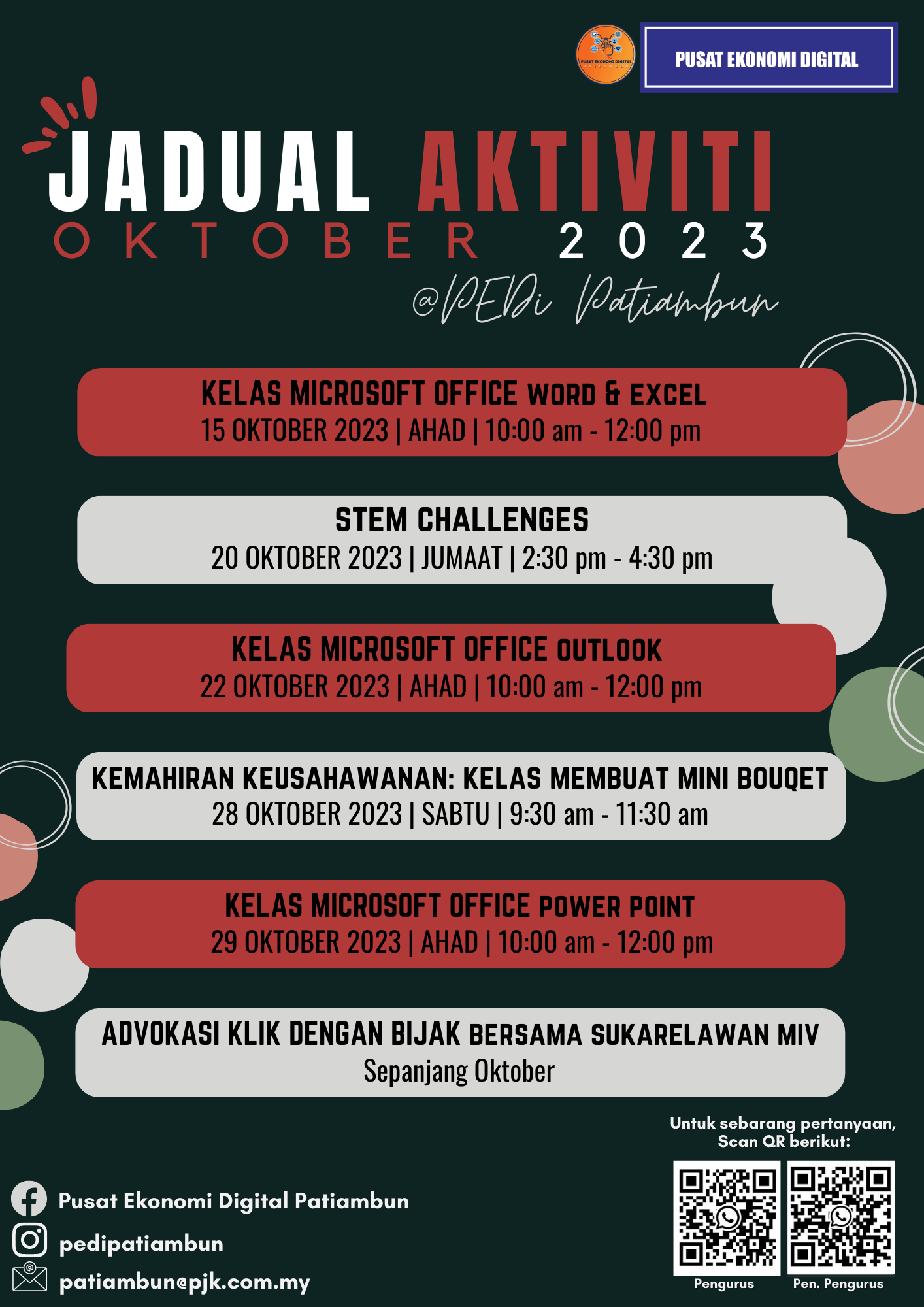 Tarikah:15 Oktober 2023 Masa:11:00am-1:00pm Tempat:PEDi Patiambun Memberikan penerangan berkenaan asas penggunaan word dan berkongsi tips dengan cara yang mudah untuk menguasai penggunaan Words. GAMBAR DISINI